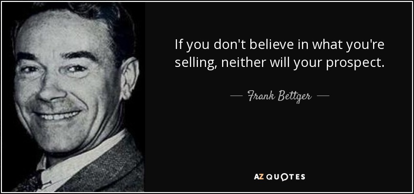 Once you believe, then you can sell to others. The biggest mistake salespeople make is staying in an industry or selling a product or service they don’t believe is good for the consumer. All you are doing is teaching yourself it is okay to manipulate for sale, leading you to be dishonest about your craft.